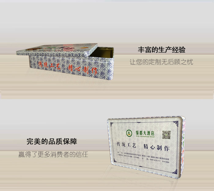 此款鐵盒采用優(yōu)質(zhì)馬口鐵為原材料,壁厚0.23毫米,規(guī)格300*200*65毫米
