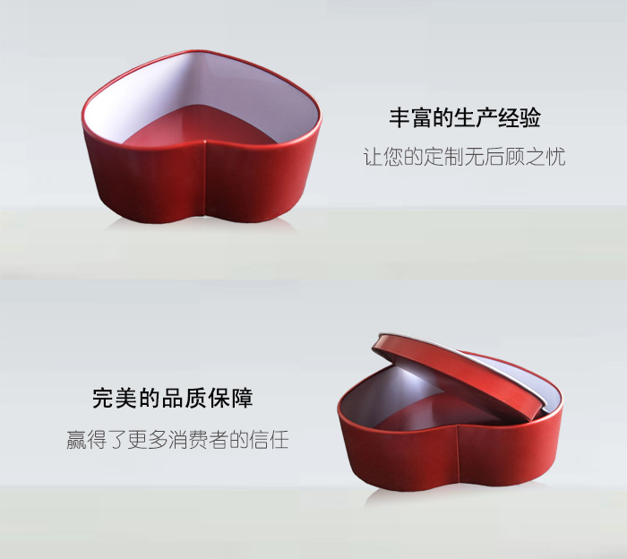 在這個 追求時尚個性的時代,年輕人喜歡追逐潮流,什么都要求來點不一樣的。連婚禮也是,潤豐鐵盒包裝有限公司為滿足年輕人的喜好,特推出這款 心形喜糖禮盒包裝盒 。一定會讓