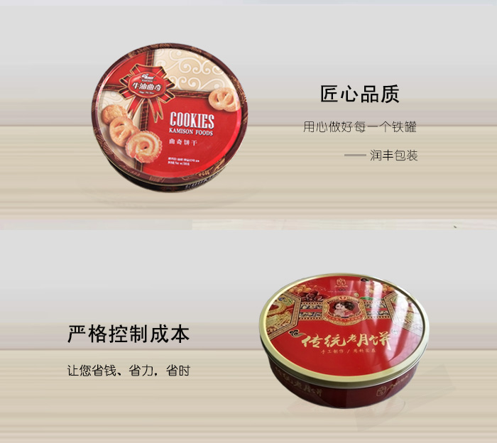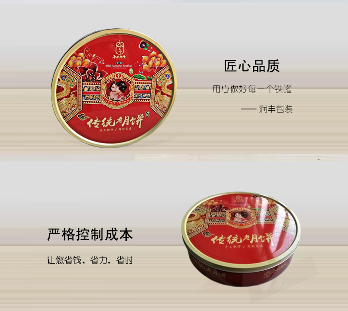 此款月餅馬口鐵盒包裝采用優(yōu)質馬口鐵為原材料,壁厚0.23毫米,直徑300毫米*61毫米,潤豐包裝可以滿足您多重需求的定制要求,歡迎新老客戶前來洽談合作。